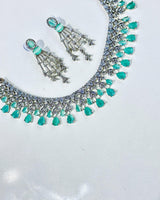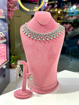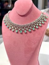 Expertly crafted in India, the Aisha Set features a stunning combination of 1 karat American diamond zircon and mint stone on a white gold plated base. Elevate your style with this imported set that exudes elegance and sophistication.