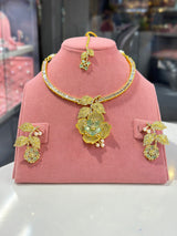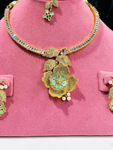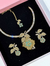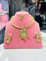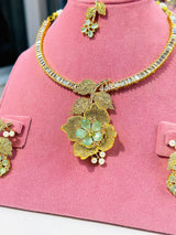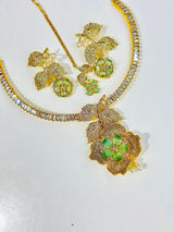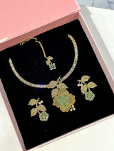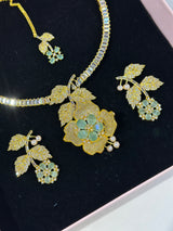 This exquisite Aliyah Set features high quality American diamond zircon stones, delicately set in a gold plated base. The intricate 3D flower design lends an elegant touch to this imported set from India. Enhance your wardrobe with a piece of luxury and craftsmanship.