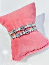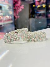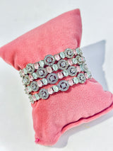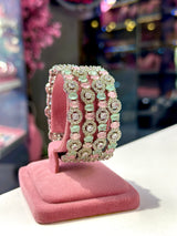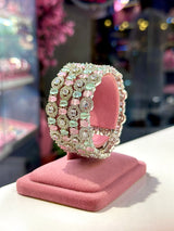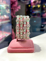 Expertly crafted from high quality American diamond zircons and a stunning PINK MINT stone, the Rachel Bangle ( is a statement jewelry piece. Imported from India and placed on a white gold plated base, this bangle exudes elegance and luxury. Elevate any outfit with its sparkling design.