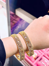 Experience luxury and elegance with Arabella Bangle's. Crafted with high quality American diamond zirconia and polki stones on a gold plated base, these Indian designer bangles are a stunning addition to any outfit. Elevate your style and make a statement with these beautifully crafted accessories.