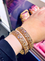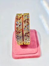 These Anushka Bangle's feature high quality American diamond and polki stones, along with gold plated base . The perfect combination of elegance and craftsmanship, these bangles will add a touch of luxury to any outfit. Expertly crafted with attention to detail, these bangles are sure to make a statement.