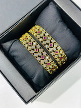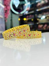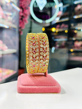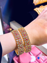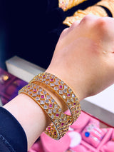 Experience the beauty and elegance of Erin Bangle's high quality gold plated Indian designer bangles, adorned with sparkling American Diamond Zirconia. Elevate your style with these exquisite, handcrafted pieces that are sure to make a statement. Perfect for any occasion, these bangles are the perfect addition to any jewelry collection.