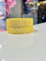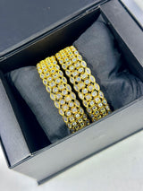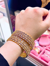 These Prisha Bangle's feature high quality American diamond zirconia and polki stones on a gold plated base. Add a touch of Indian designer style to your look with these elegant and intricately designed bangles.