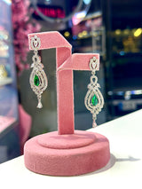Expertly crafted with high quality American diamond zircons and a stunning emerlad colored stone on a white gold plated base, our Demi earrings add a touch of elegance and sophistication to any outfit. Handmade in India, these earrings are a perfect balance of timeless design and modern style.