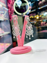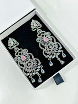 Add a touch of elegance to any outfit with our Esme Earrings. These lightweight and intricately designed earrings feature 1 karat American diamond zircons and pink stones on a silver plated base, imported from India. Perfect for any party, these earrings will elevate your style and make a statement.