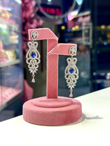 Experience luxury with our Trinity Earrings, featuring high-quality American diamond zircons and sapphire stones on a white gold-plated base. Handcrafted in India, these earrings showcase stunning craftsmanship and are perfect for any occasion. Elevate your style with these elegant and timeless earrings.