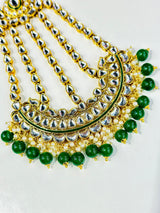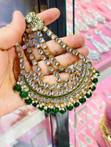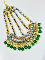 Saisha is a beautiful Kundan Jhumar adorned with green moti and white pearls. Handcrafted to perfection, it adds a touch of elegance and sophistication to any outfit. Elevate your style with this timeless piece that radiates luxury and charm.