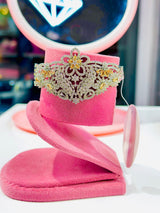 The Amara Designer Handcuff features high-quality American diamond zirconia and champagne stones on a rhodium-plated surface. Imported from Dubai, this unique designer handcuff showcases a stunning and intricate design, making it the perfect accessory for any occasion. Enhance your style with this one-of-a-kind handcuff.