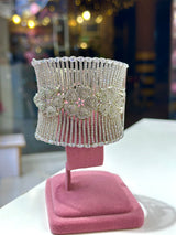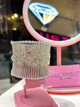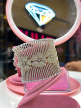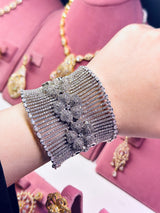 Experience luxury and style with the Kaylee Designer handcuff. Made with high quality micro American diamond zircons on a Rhodium plated base, this unique handcuff is imported from Dubai. Elevate any outfit with this designer piece that exudes sophistication.