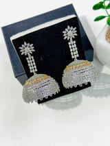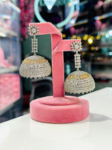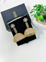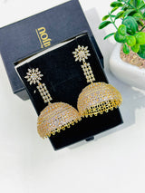 The Kiara Jhumka is a stylish and elegant earring with high quality american diamond zircons on a gold plated base. These designer jhumkas add a touch of luxury and sophistication to any outfit. Elevate your look with these exquisite earrings.