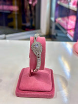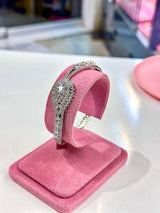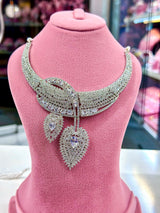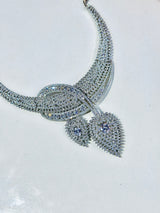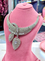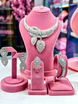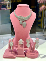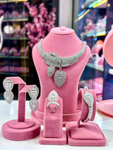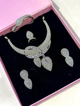 Introducing the Alessia Designer Set - a high-quality AAA+ grade American diamond zircons on white gold plated unique design base. Imported from Dubai, this set features an openable handcuff and adjustable ring for added convenience. Elevate your style with this luxurious and elegant set.