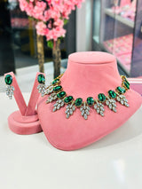 The Anaya Set  features a stunning Green rhinestone necklace set on an antique gold plated base, imported from China. With its unique design and high-quality materials, this set adds a touch of elegance to any outfit. Don't miss out on this imported beauty.