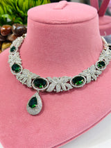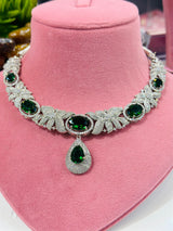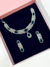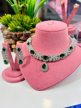 The Azalea Designer Set is a stunning piece of jewelry featuring high quality micro American diamond zircons and a Emerald stone on a white gold plated base. The unique design and luxurious materials make it a must-have addition to any collection. Imported from Dubai, this designer set is the epitome of style and elegance.