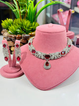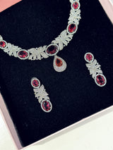 The Azalea Designer Set is a stunning piece of jewelry featuring high quality micro American diamond zircons and a ruby stone on a white gold plated base. The unique design and luxurious materials make it a must-have addition to any collection. Imported from Dubai, this designer set is the epitome of style and elegance.