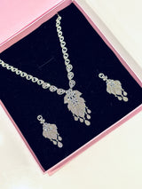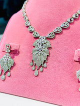 This Carla Designer Set features micro American diamond zircon on a white gold plated base imported from Dubai. The unique design is sure to make a statement and add elegance to any outfit. Made with the highest quality materials and expert craftsmanship.