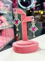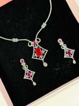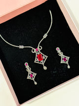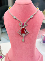 Upgrade your jewelry collection with the Oceane Designer Set in Silver. Made with high quality AAA+ grade American diamond zircon stones and Ruby stone, this designer set features a unique and elegant design. Imported from Dubai, it is sure to add a touch of luxury to any outfit.