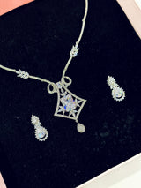 Upgrade your jewelry collection with the Oceane Designer Set in Silver. Made with high quality AAA+ grade American diamond zircon stones, this designer set features a unique and elegant design. Imported from Dubai, it is sure to add a touch of luxury to any outfit.