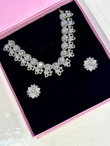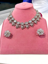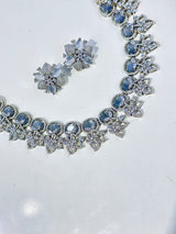 Introducing the Sanjana Set - a stunning designer set imported from India. Featuring American diamond zircons and beautiful Grey stones on a silver-plated base, this set is perfect for adding a touch of elegance to any outfit. Expertly crafted, this set is a must-have for any jewelry collection.