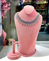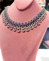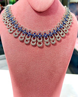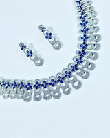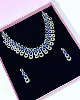 The Zohra Designer Set  is crafted with high-quality micro American diamond zircons and sapphire stones on a unique white gold-plated base. Imported from Dubai, this set exudes luxury and elegance. Elevate your style with this statement piece.