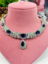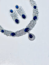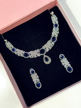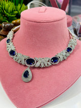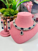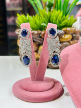 The Azalea Designer Set is a stunning piece of jewelry featuring high quality micro American diamond zircons and a Sapphire stone on a white gold plated base. The unique design and luxurious materials make it a must-have addition to any collection. Imported from Dubai, this designer set is the epitome of style and elegance.