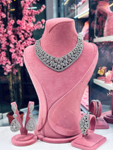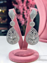 Discover the exquisite beauty of the Evangeline Designer Set. Adorned with micro American Diamond Zircon stones and crafted on a white gold plated base, this rare piece is a unique design collected from Dubai's top designer jewelry auctions. Elevate your style with this luxurious set.