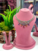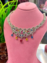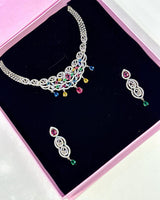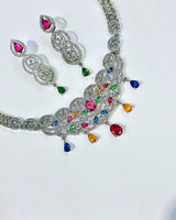Indulge in luxury with the Zoya Designer Set. Featuring high quality American diamond zircons and vibrant semi-precious stones, this set is sure to make a statement. With a stunning white gold plated base and intricate design imported from Dubai, this set is the perfect addition to any jewelry collection. Elevate your style and make a statement with the Zoya Designer Set.
