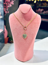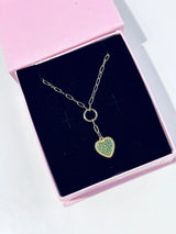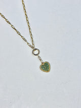 Ember features exquisite emerald stones adorning a heart-shaped pendant, crafted from gold plating and imported for the highest quality. Elevate any outfit with this elegant and timeless accessory.