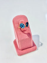 This MAJESTIC RING radiates beauty with skyblue and dark blue rhinestones elegantly set in a delicate and modern gold-plated base. Imported with fine craftsmanship, this ring exudes sophistication and style, making it the perfect addition to any outfit. Elevate your look with a touch of luxury and capture all eyes with this stunning piece of jewelry.