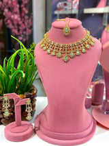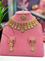 Expertly crafted in India, the Aria Set features high-quality American diamond zircons and mint stones on a gold-plated base. Elevate your look with this luxurious and elegant piece, perfect for any occasion. Experience the beauty and sophistication of Indian jewelry with the Aria Set.