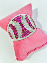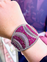 Expertly crafted with high quality American diamond zircons and ruby stones on a Rhodium plated base, the Delilah Designer Handcuff boasts a unique and stylish design imported from Dubai. Elevate any outfit with this exquisite and luxurious handcuff.
