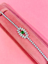 The Lacey Bracelet features high-quality American diamond zircons and a vibrant emerald stone set on a white gold-plated base. This imported piece combines exquisite craftsmanship with elegant design, making it a refined accessory that enhances any outfit with a touch of sophistication and sparkle.