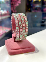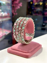 Enhance your style with the Mariana Bangle in Pink Mint. Featuring 1 karat American diamond zircons and beautiful pink mint stones on a silver plated base, these imported bangles from India add a touch of elegance to any outfit. Perfect for any occasion.