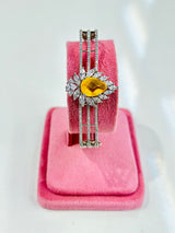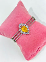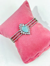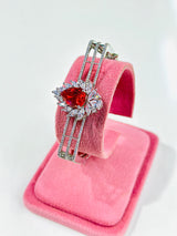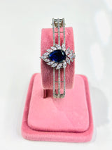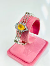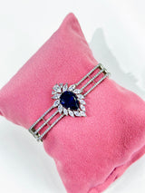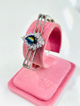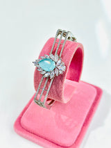 Indulge in luxury with the Quinn Designer Handcuff, featuring high quality American diamond and semi-precious stones on a rhodium plated cuff. Imported from Dubai, this unique design is perfect for partywear and exudes elegance. Elevate your fashion game with Quinn