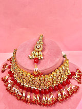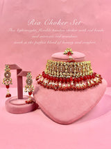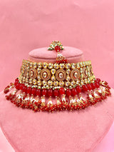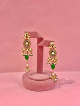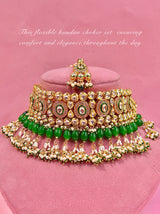 This premium kundan choker set boasts high-quality kundans on a pure brass base, adorned with vibrant green beads and intricate green minakari work. A masterpiece of traditional craftsmanship.This flexible kundan choker set adapts to your every mood, ensuring comfort and elegance throughout the day.