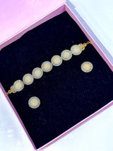 Expertly crafted in Pakistan, the Sania Choker Set features crush stones on a gold plated base. Perfect for a night out, this partywear set adds a touch of elegance and sophistication to any outfit. Elevate your look with this beautiful and versatile accessory.